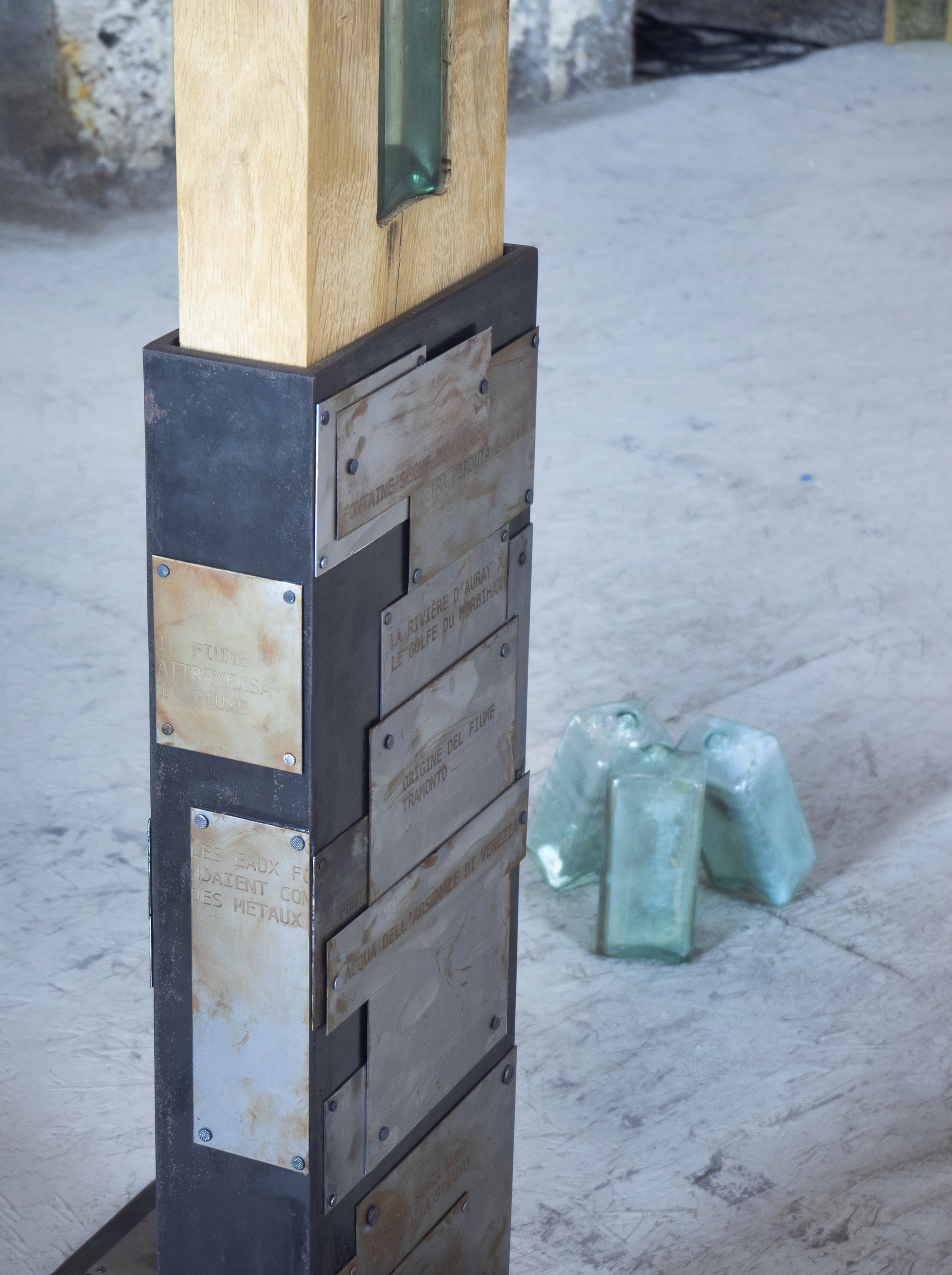 In the 4.50 meters of the column, are contained many "fragments" of water. Each time the sculpture is exhibited, it takes some water of the location in charge within it. Also, many rivers, seas, sources and fountains nourishes the sculpture with their names. The bricks of glass embedded in the beam are original objects from the 40’s, crafted in Berlin for the purpose of rebuilding the stained window of a church destroyed in bombings. Those objects are interesting because it is difficult to tell if they are bricks or bottles. In this confusion, the transparence of the water contained in the bricks may be the window to an open space, a portrait of an abstract territory, made of the many intertwining between the waters collected by the artist.