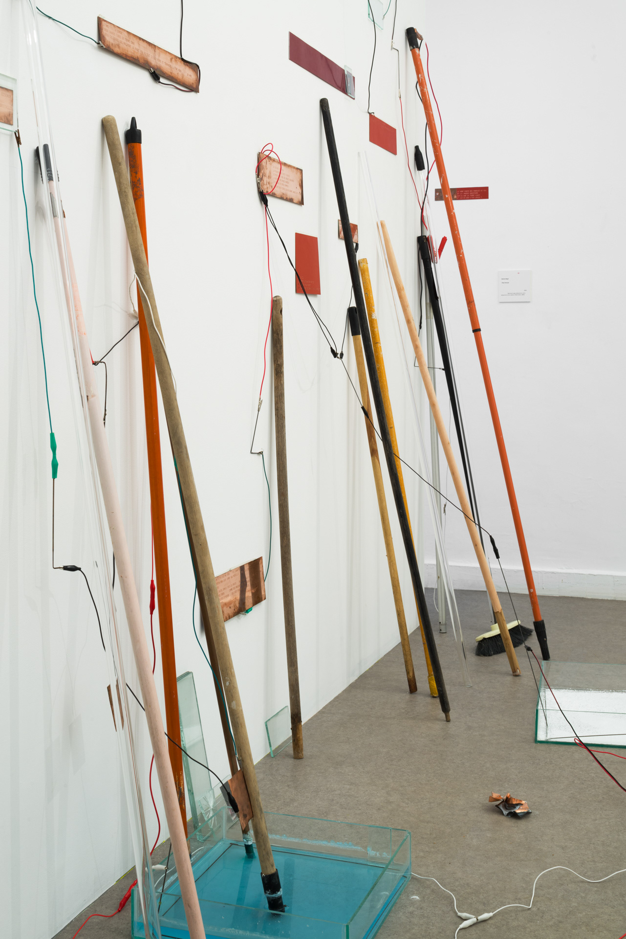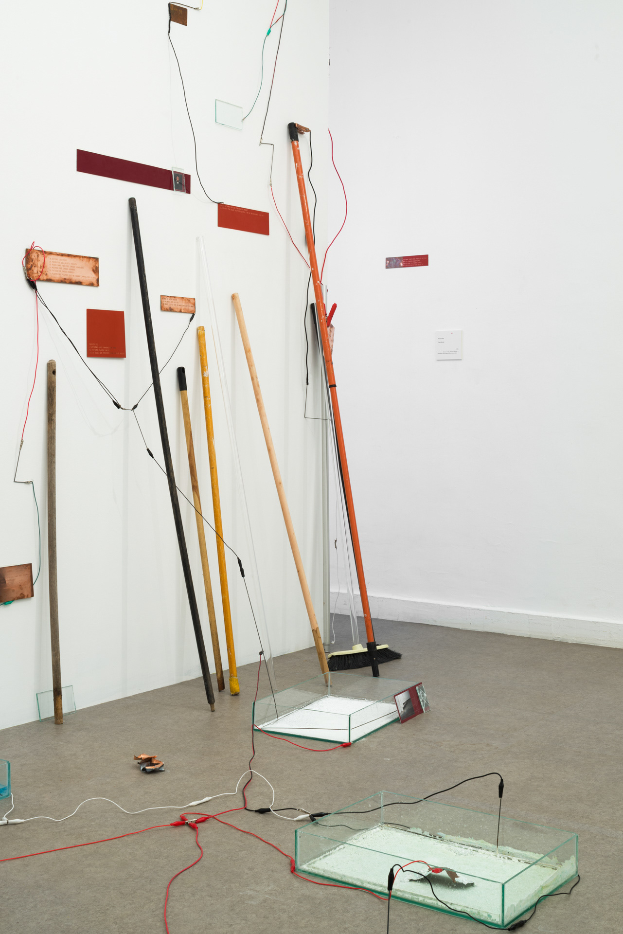 L’installation Their Broom (2) est la rencontre de plusieurs éléments connectés dans un circuit électrique qui les lie.